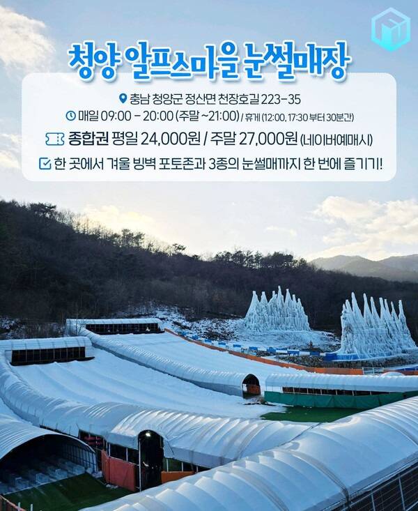 매년 겨울 얼음분수축제가 펼쳐지는 청양 알프스마을에도 눈썰매장이 조성되어 있습니다. 축제 입장권과 썰매 이용권이 포함된 통합요금은 평일 24,000원, 주말 27,000원으로 사전에 네이버예매를 추천하는데요. 축제의 하이라이트 포토존인 웅장한 얼음분수, 눈조각, 얼음조각 전시도 함께 관람할 수 있습니다.
