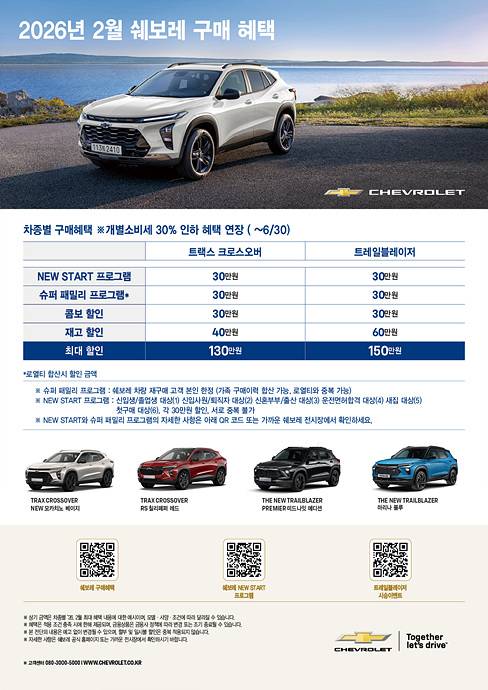 이번 2월 프로모션의 핵심은 새출발을 앞둔 고객을 대상으로 하는 New Start 특별 할인이다. 트랙스 크로스오버와 트레일블레이저 구매 고객 중 입학생, 졸업생, 신입사원, 퇴직자, 신혼부부, 출산 가정, 신규 면허 취득자, 이사 및 주택 구매 고객에게 30만 원을 할인한다.