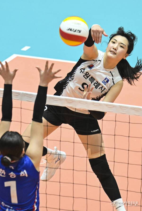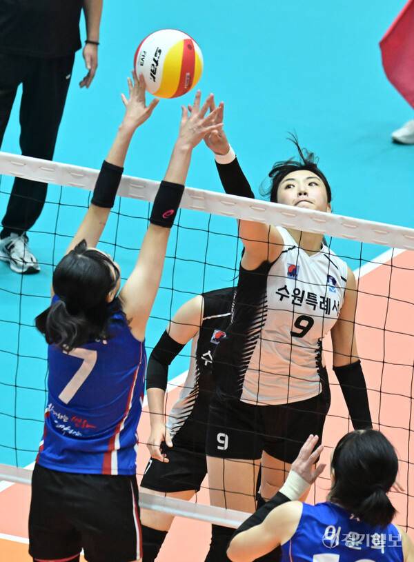 22일 오후 부산광역시교육청 학생교육문화회관에서 열린 ‘제106회 전국체육대회’ 배구 여자 일반부 결승 경기도와 경상북도의 경기에서 윤영인(수원특례시청)이 상대 블로킹 사이로 스파이크를 때리고 있다.