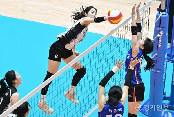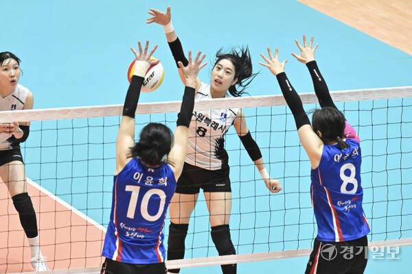 22일 오후 부산광역시교육청 학생교육문화회관에서 열린 ‘제106회 전국체육대회’ 배구 여자 일반부 결승 경기도와 경상북도의 경기에서 최윤이(수원특례시청)가 스파이크로 상대 블로킹을 뚫고 있다.