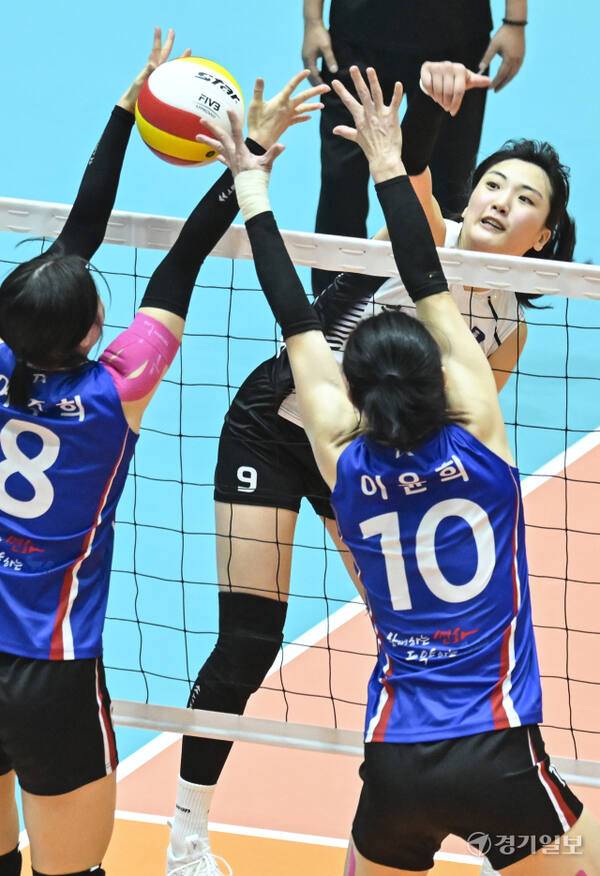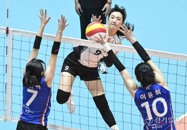 22일 오후 부산광역시교육청 학생교육문화회관에서 열린 ‘제106회 전국체육대회’ 배구 여자 일반부 결승 경기도와 경상북도의 경기에서 김나희(수원특례시청)가 이동공격을 시도했지만 상대 블로킹에 막히고 있다.