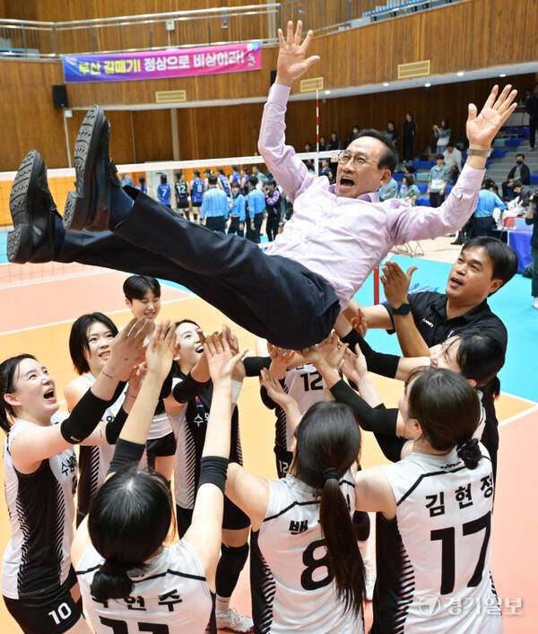 22일 오후 부산광역시교육청 학생교육문화회관에서 열린 ‘제106회 전국체육대회’ 배구 여자 일반부 결승 경기도와 경상북도의 경기에서 경기도(수원특례시청)가 세트 스코어 3-0(25-23, 25-20, 25-16)으로 승리를 거둬 1위를 달성한 후 선수들이 신현삼 수원시배구협회장을 헹가래하고 있다.