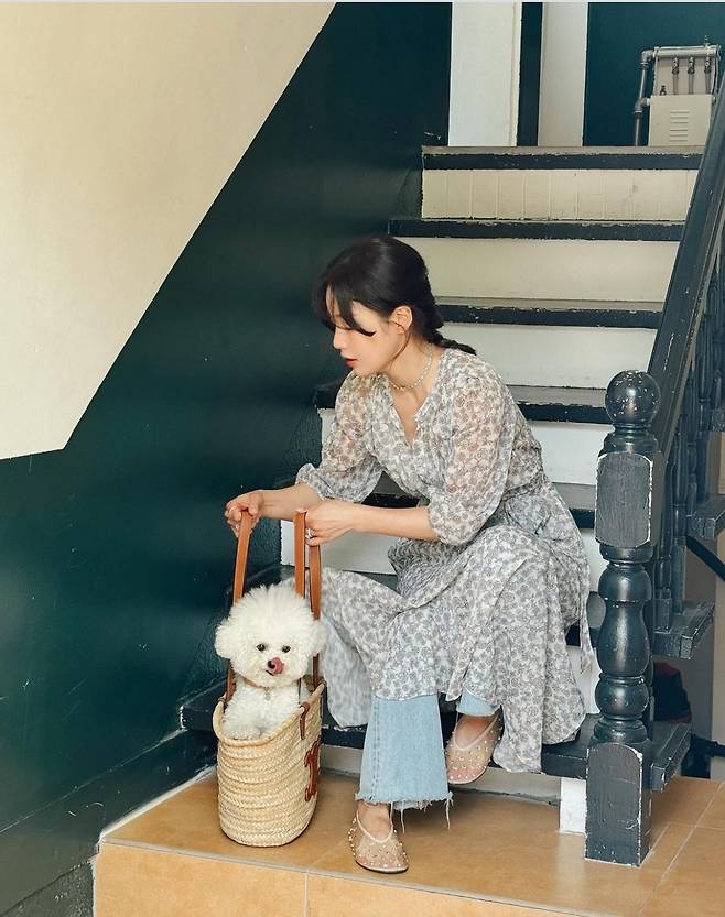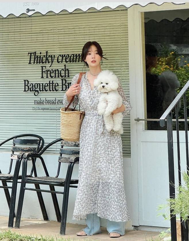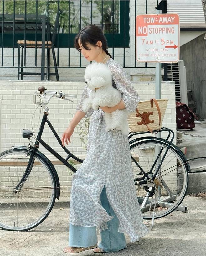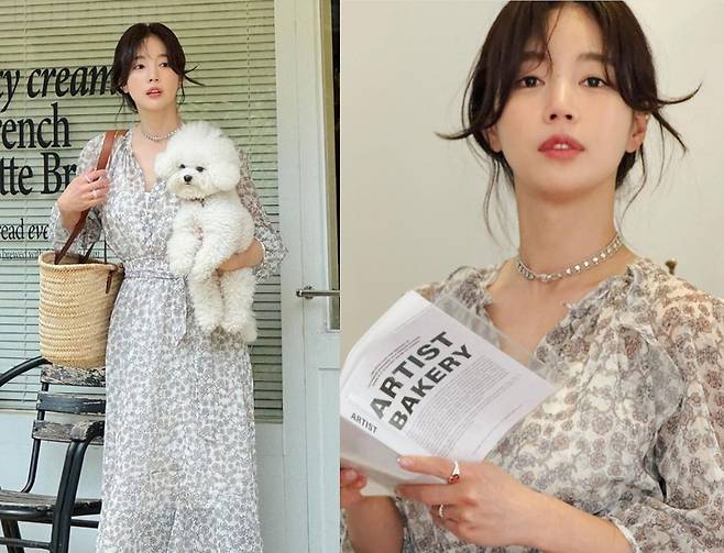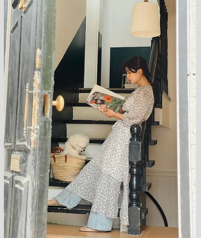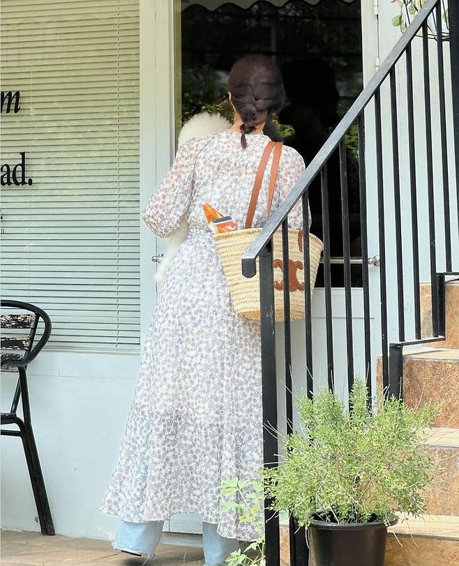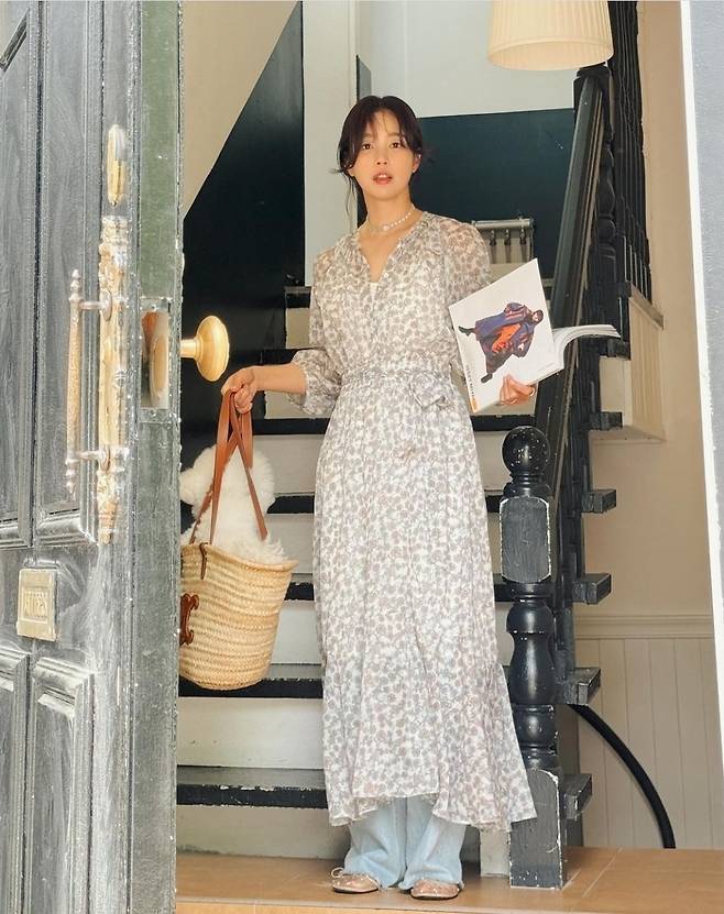 기은세는 흐르는 듯한 실루엣의 플로럴 패턴 롱 원피스를 착용해 편안하면서도 스타일리시한 패션을 선보였습니다.