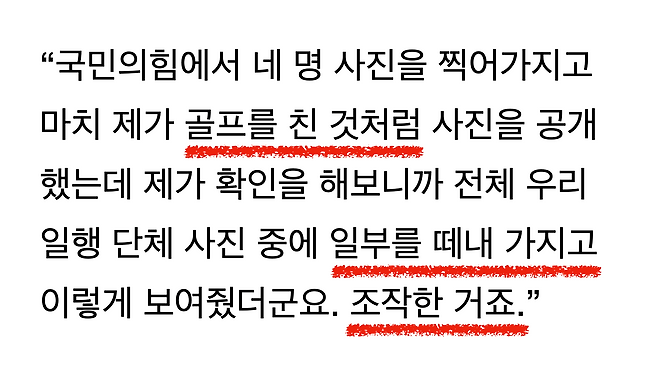 - 핵심은 “골프를 친 것처럼 조작했다”는 발언이다. 이재명이 “김문기를 (개인적으로) 몰랐다”고 한 건 개인적 인식의 영역이니 그럴 수 있다 치더라도 골프를 쳐놓고 안 친 것처럼 주장한 것은 허위 사실 공표에 해당한다는 1심 재판부의 결론이었다.