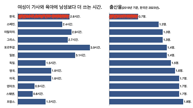 - 한국은 세계적인 반면 교사다. 여성들이 집안일에 보내는 시간이 남성보다 2.8시간 많다. 출산율은 2023년 기준으로 0.72명까지 떨어진 상태다.