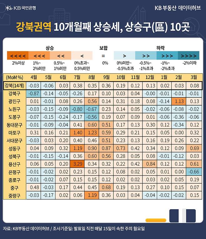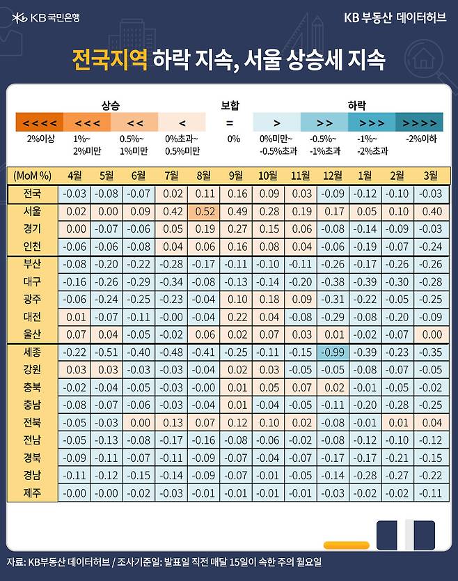 3월 지역별 주택가격 변동을 색상 테이블로 구분했습니다. 붉은색이 진할수록 전월 대비 상승률이 큰 지역이고, 옅어질수록 회복이 적은 지역입니다. 푸른색은 하락 지역입니다.