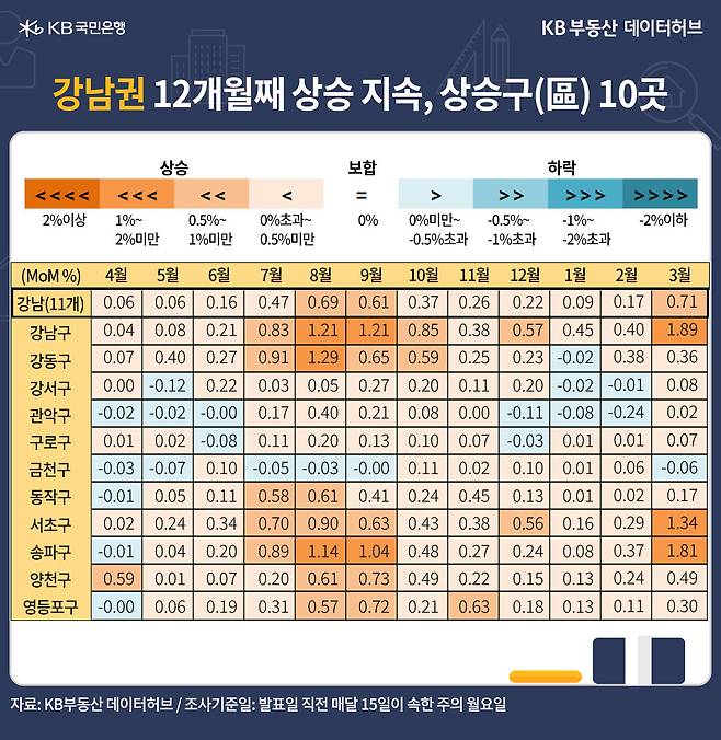 강남권 상승률은 지난해 8~9월 0.6%대에서 올해 1월 0.09%로 줄었지만, 12개월째 상승세를 유지했고 강남권과 강북권 간 양극화도 뚜렷해졌습니다. 강남권 대비 강북권 증감률갭이 지난해 8월 0.34%p에서 올해 1월 0.07%p로 내려갔지만, 3월 들어 0.63%p로 확대되는 등 강남권 우세가 첨예합니다. 상승구(區)도 지난해 11월 11개구 전 지역 상승에서 올해 1월 외곽지역인 관악구의 약세와 강동ㆍ강서구의 경계매물 출회로 8곳으로 줄었죠. 그런데 3월 들어 상승구가 10곳으로 늘었습니다. 강남3구가 강남권 상승을 주도했습니다.