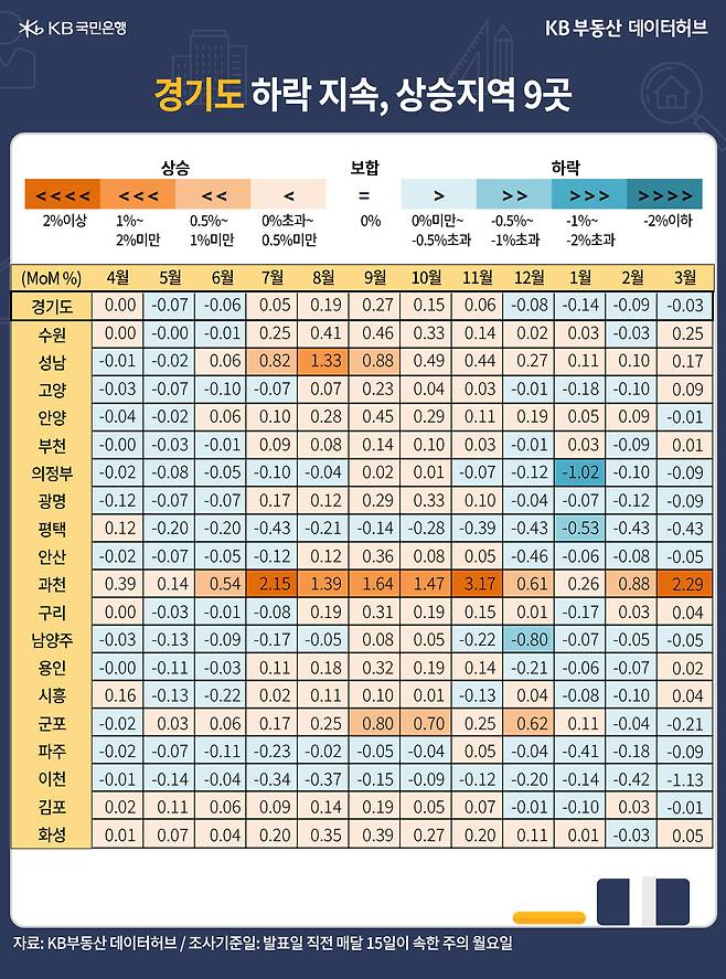 경기도 매매가격 전월 대비* 증감률이 지난해 12월 -0.08%로 하락 전환에 이어 신년 1월하락률이 -0.14%로 확대됐으나, 3월 -0.03%로 낙폭이 줄었습니다. 상승지역이 지난해 11월 14곳에서 올해 1월 7곳으로 적어졌으나, 3월 9곳으로 안정을 찾았습니다. 준(準)강남권 과천ㆍ성남시의 상승에 힘입어 경기도 전체의 가격조정폭이 줄어든 것입니다. 과천은 상승률이 2.29%에 달해 서울ㆍ수도권 상승률 Top입니다. 수원이 신분당선, 인덕원 동탄선 영향으로 상승률이 0.25%에 달해 성남을 제치고 경기도 2순위로 집계됐습니다.