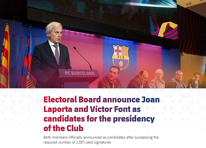 바르셀로나는 오는 3월 15일 회장 선거를 치른다. 5년마다 치러지는 회장 선거에서 주안 라포르타와 빅토르 폰트가 다시 만났다. 2021년 선거에선 라포르타가 54%의 지지를 받으며 당선되었고 지난 5년 동안 나름 성공적인 지도력을 보였다는 평을 듣고 있다. 라포르타 회장 밑에서 바르셀로나는 재정적 위기를 극복하면서 라 리가 2회, 코파 델 레이 2회, 수페르코파 3회 우승을 달성했다. 또한, 라 마시아를 통해 라민 야말, 쿠바르시, 베르날 등 스타가 등장했고, 홈구장 ‘캄 누’ 확장 공사도 성공적으로 진행되고 있다.