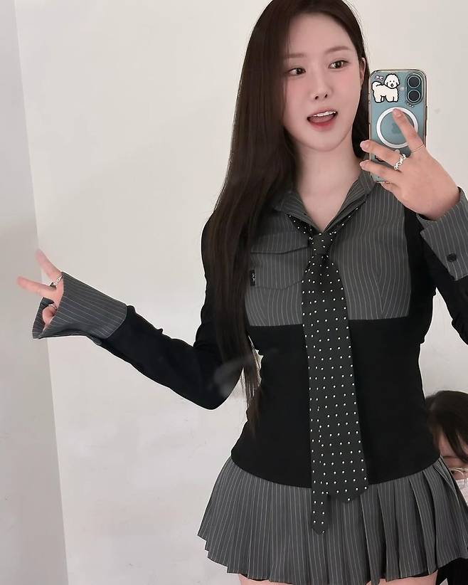 이번 착장의 핵심은 과하지 않으면서도 눈에 띄는 디테일이다. 소매는 와이드하게 퍼지는 핏으로 손끝을 자연스럽게 덮어주며, 하의는 미니 기장의 플리츠 스커트로 다리 라인을 더욱 강조한다. 특히 시선을 끄는 것은 민영이 연출한 도트 타이 스타일링이다. 셔츠와 동일한 톤을 유지하면서도 작은 도트 패턴으로 포인트를 주어 전체적인 밸런스를 살렸다.