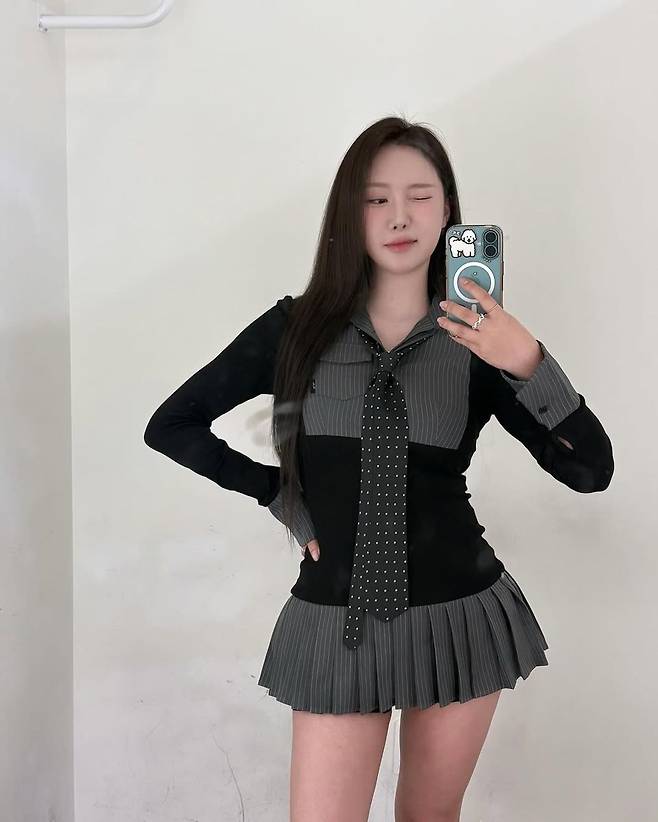 민영의 긴 생머리와 내추럴한 메이크업이 룩의 단정한 분위기를 더욱 부각시키며, 블랙과 그레이 계열의 믹스가 깔끔하면서도 도시적인 무드를 완성했다. 전체적으로는 교복을 연상케 하는 하이틴 무드에 미니멀한 Y2K 감성이 가미된 스타일로, 포멀하면서도 캐주얼한 매력을 동시에 발산한다.