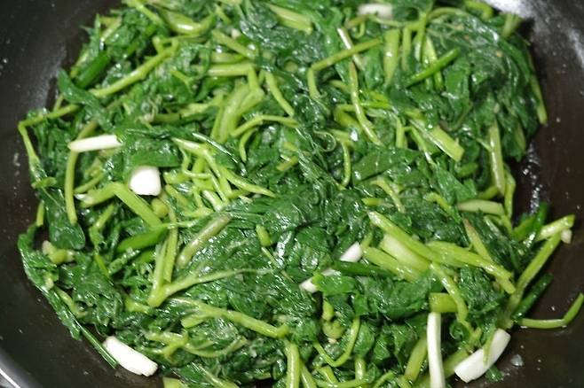 5. 곰취를 넣고 멸치 액젓을 넣어 함께 볶아줍니다.