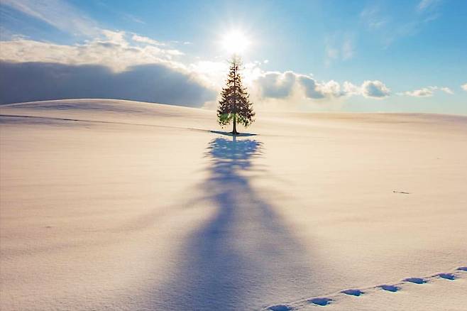 온통 흰 눈으로 뒤덮인 평야에 나 홀로 서 있는 크리스마스 나무는 최고의 사진 촬영 장소로 손꼽히고 있습니다.