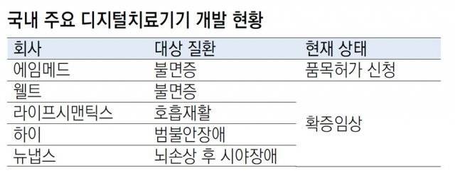 국내에서도 디지털치료제 개발 및 임상이 활발하게 이뤄지고 있다. 현재 에임메드, 웰트, 라이프시맨틱스, 하이, 뉴냅스 등 5개 헬스케어 관련 기업들이 임상 중이다. 연내 국내 1호 디지털치료제가 나올 것으로 기대되고 있다. 임상이 진행되거나 완료된 분야는 불면증, 불안장애, 호흡기질환 재활, 뇌 손상 후 시야장애 등이다.