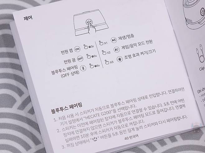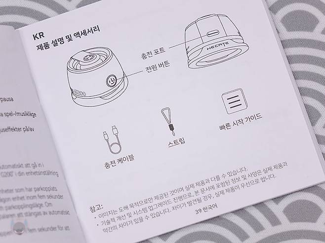 제품 포장은 G200 스피커 비닐 포장과 함께 흔들리지 않게 제품 크기에 맞춘 틀-포장재를 사용했으며, 제품 구성에는 G200 블루투스 스피커, USB 충전 케이블, 스트랩, 제품설명서로 이루어져 있습니다. 방금 확인했던 제품 기본 사양에는 한국어가 포함되어 있지않지만, 제품설명서에는 한국어가 포함되어 있죠.