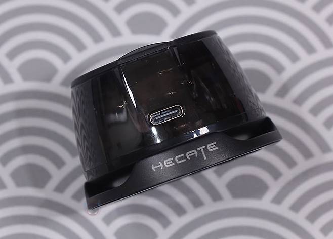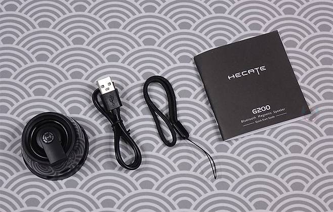 좀 더 자세히 살펴보면, 전면에는 전원 버튼(Power button)이 배치되어 있는데, 전원 On/Off 뿐만 아니라 페어링(Pairing), 재생(Play), 모드(Mode), RGB On/Off 기능도 함께 사용되죠. 측면에는 모델명을 확인할 수 있으며, 상단에는 HECATE 로고 표시와 함께 안쪽에 외부로 노출된 40mm 풀-레인지 유닛을 확인할 수 있습니다. 그리고, 후면에는 제공되는 USB 충전케이블과 연결되는 USB Type-C 포트가 배치되어 있으며, 밑바닥에는 안전 인증과 소비전력 표시와 함께 테두리 라인으로 패드가 부착된 것을 확인할 수 있죠. 사실 이 부분 봐도 스마트폰에 사용되는 마그네틱 기능이 적용되었다라는 걸 짐작할 수 있습니다. 그리고, 기본 제공되는 USB 충전케이블은 약 50cm 길이에 USB Tpye A to C 인터페이스를 가졌으며, 스트랩은 바닥 부분에 있는 틈새로 연결해 장착 사용할 수 있습니다.