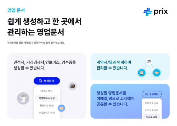 프릭스는 견적서, 인보이스, 거래명세서 같은 영업 문서 및 공유 기능, 세금계산서 발급 기능(연내 구현 예정) 및 대시보드 기능 제공을 통해 계약의 사후관리 단계 전반을 지원하고 있다.