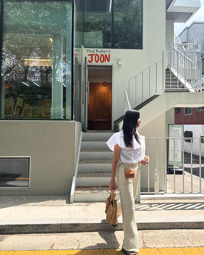 라탄 스타일 토트백과 작은 브라운 크로스백으로 소품까지 편안한 무드로 통일하며, 도심 속에서도 휴양지 같은 여유를 담아냈어요.