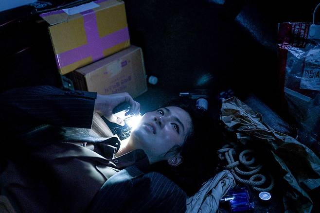 또 다른 스틸에서는 잡동사니들이 흩어진 트렁크 안에서 체념한 표정으로 누군가와 전화 통화를 하고 있는 ‘유나’를 확인할 수 있다.