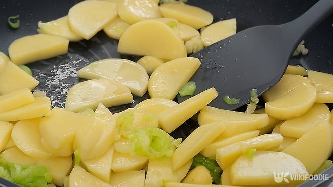 8. 절인 감자의 물기를 빼고 팬에 넣어 3분간 볶는다.