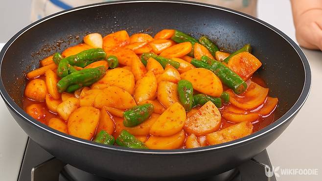 먼저 팬에 식용유 2큰술을 두르고 대파 2큰술을 넣는다. 중불에서 1분 정도 볶아 파기름을 낸다. 파 향이 올라오면 다진 마늘 1큰술을 넣고 30초 정도 더 볶는다. 마늘이 살짝 노릇해지면 절인 감자를 물기 빼고 넣는다. 감자가 익을 때까지 약 3분간 중불에서 볶는다. 양념장을 붓고 잘 섞은 뒤, 양파, 꽈리고추를 차례로 넣고 2분간 더 볶는다.