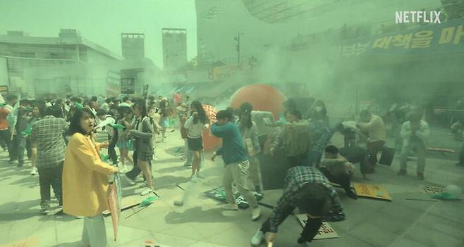 넷플릭스가 몇 달 전 또 한 편의 디스토피아물을 선보였다. 소행성과의 충돌을 앞둔 한반도에서 일어나는 일을 그린 12부작 드라마 <종말의 바보>가 그것이다. 일본 작가 이사카 코타로의 동명 원작을 극화한 이 작품은 색다른 K-디스토피아를 제시할 것으로 기대를 모았다. 원작이 생존 투쟁, 재난 극복 등 아포칼립스 장르물의 전형적 서사를 벗어나 죽음을 수용한 이들의 담담한 일상을 그려 호평받은 바 있기 때문이다. 드라마계의 두 대가인 정성주 작가(<아줌마>, <밀회>, <풍문으로 들었소> 등)와 김진민 감독(<개와 늑대의 시간>, <인간수업>, <마이 네임> 등)이 의기투합한 점도 신뢰도를 높였다.