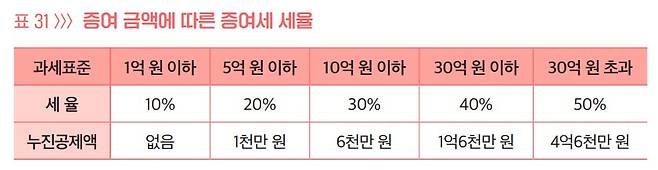 증여세 과세표준에 세율을 곱한 후 누진공제액을 빼면 됩니다. 일반적으로 3억 원을 증여할 경 우라면 세율이 20%이고 누진공제액이 1천만 원이므로 산출세액은 5천만 원(=3억 원×20%-1천만 원)이 됩니다.