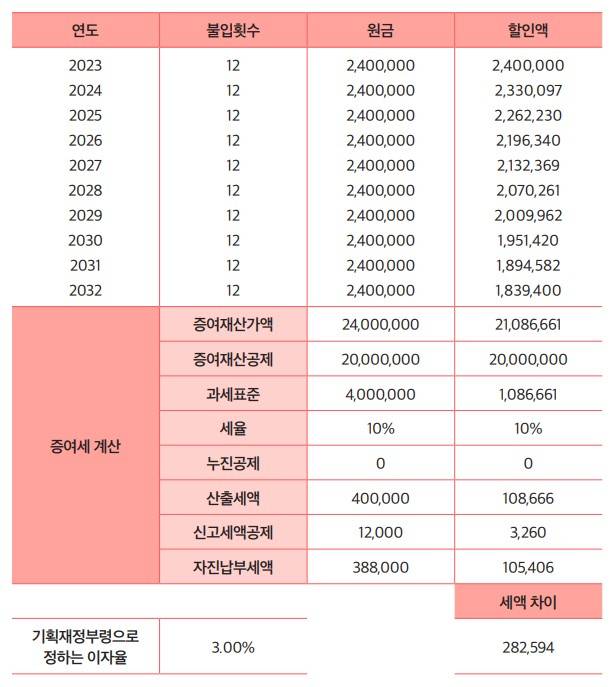 매해의 할인액을 계산하는 방법은 증여하는 금액을(1+할인율)^(경과연수)로 나누면 되는데 10년 동안의 원금과 할인액은 위 증여재산평가 예시표와 같습니다. 현재 정부가 정한 할 인율이 3%이므로 ‘1+할인율’은 1.03이 됩니다. 총 282,594원의 세금을 절감할 수 있게 되는 것이지요.
