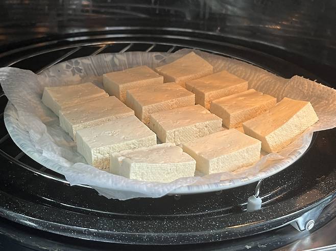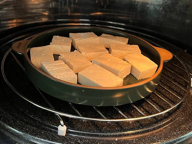 만일 시간이 없다면 두부를 한 입 크기로 썬 다음 전자레인지를 활용해 보세요. 자른 두부를 내열 접시에 담고 전자레인지에 1분~ 2분 정도만 돌려 보세요. 열기에 의해 내부의 수분이 빠르게 밖으로 빠져나오게 됩니다.