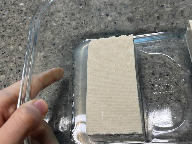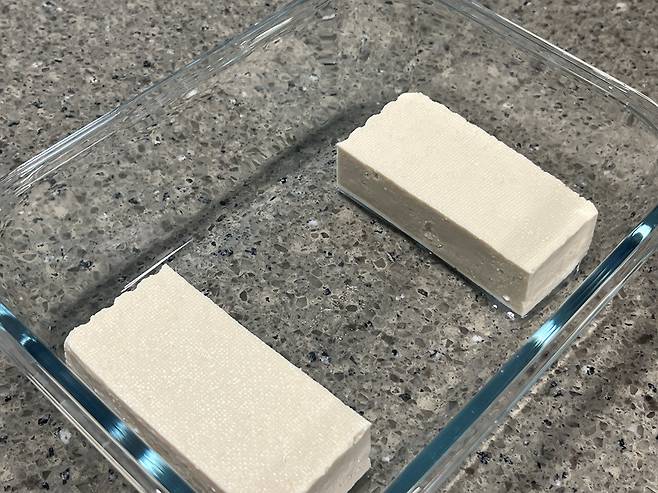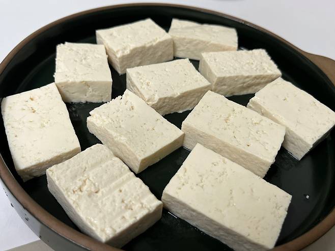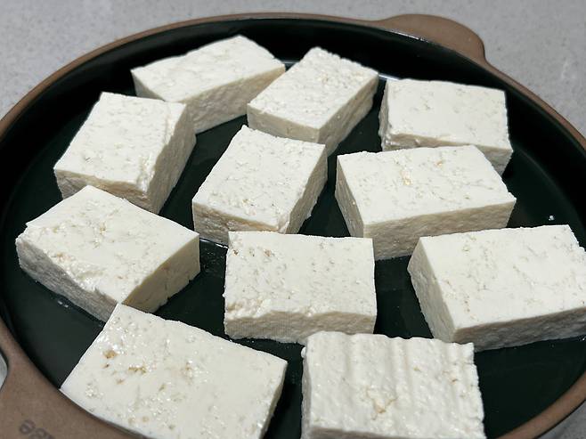 두부는 그냥 잘라두는 것만으로도 수분이 자연스럽게 빠져나오기 시작합니다. 시간이 여유 있다면 그냥 접시나 도마 위에 잘라두기만 하세요. 두부의 세포 조직이 잘리면서 그 단면을 통해 머금고 있던 물기가 흘러나오게 됩니다.
