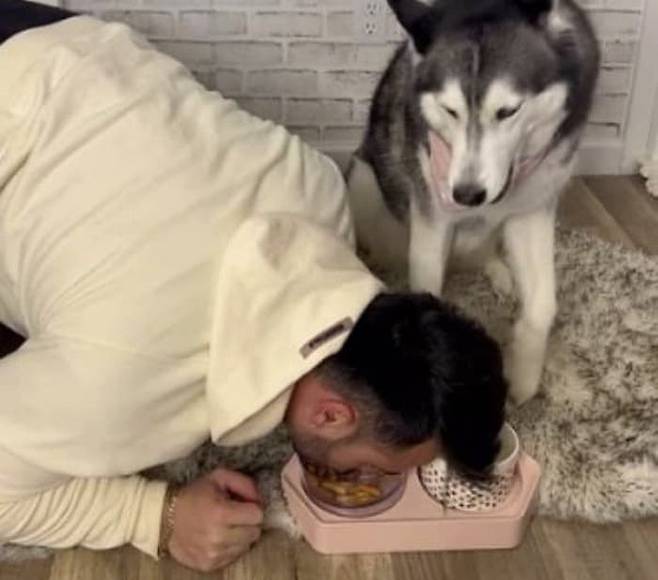 공개된 영상에 따르면 평소 장난기가 유독 많고 심한 아빠 집사는 시베리안 허스키 강아지가 보는 앞에서 고개를 숙여 밥그릇에 담긴 밥을 먹는 척 시늉했죠.
