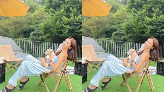 두 번째 스타일은 캠핑장에서의 편안한 무드가 인상적이다. 그는 은은한 광택이 감도는 하늘색 슬립 원피스를 선택했다. 루즈한 핏의 원피스는 활동성을 보장하면서도 반려견과 함께하는 휴식의 순간에 이상적인 선택이었다.