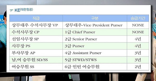 2년제 대학 졸업생 기준 인턴 2년+일반 승무원 3년, 4년제 대학 졸업생 기준 인턴 2년+일반 승무원 1년의 근무 기간을 채워야 합니다. 여기서 승무원 직급체계를 간단히 확인하고 가겠습니다.