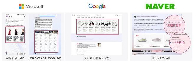 이에 따라 국내외 빅테크 기업들이 너도나도 생성형 AI를 검색에 도입해 이용자에게 새로운 경험을 제공하고 있습니다. 그리고 자연스럽게 생성형 AI 검색에 다양한 광고도 도입될 것으로 전망됩니다. 이미 주요 기업에서는 AI 검색 전용 광고를 테스트하고 있는데요. MS와 Google, 네이버 등이 베타 테스트를 진행하고 있죠.