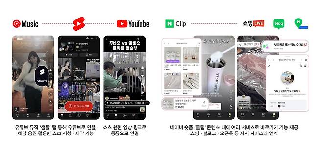 - 네이버 : 네이버의 숏폼인 ‘클립’에서 네이버의 여러 서비스로 바로가기 기능을 제공하고 있는데요. 쇼핑, 블로그, 오픈톡 등 자사 서비스로 연결하고 있어요.