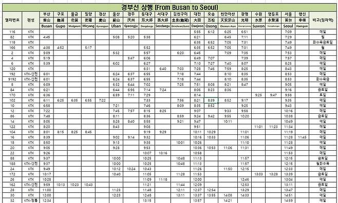 ๊ฒฝ๋ถ์ (์์ธ-๋ถ์ฐ) - ์์ธ์ญ, ๊ด๋ช ์ญ, ์ฒ์์์ฐ์ญ, ์ค์ก์ญ, ๋์ ์ญ, ๊น์ฒ๊ตฌ๋ฏธ์ญ, ๋๋๊ตฌ์ญ, ์ ๊ฒฝ์ฃผ์ญ, ์ธ์ฐ(ํต๋์ฌ)์ญ, ๋ถ์ฐ์ญ / ์ต๋จ 2์๊ฐ 15๋ถ / ํ๋ฃจ 150ํ ์ด์ ์ดํ