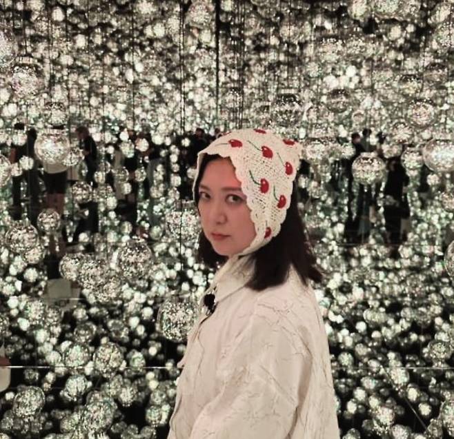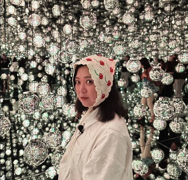 은하수처럼 반짝이는 전시 공간 속에서 김숙은 크랙 텍스처가 살아 있는 오버핏 셔츠에 체리 패턴의 크로셰 보닛을 매치해 유쾌하면서도 독창적인 룩을 완성했습니다.