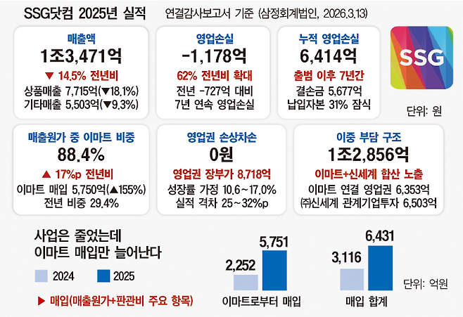 SSG닷컴은 지난해 연결기준 매출 1조3471억원, 영업손실 1178억원을 기록했다. 매출은 전년 대비 14.5% 감소했고 영업손실은 62% 늘었다. 출범 이후 7년 연속 영업손실이 이어지며 누적 손실만 6414억원에 이른다.