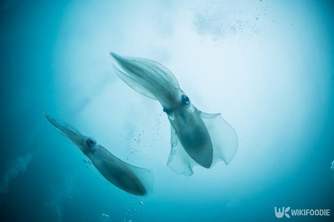 늦봄부터 초여름이 제철인 무늬오징어는 몸통이 굉장히 넓어 얼핏 보기엔 갑오징어처럼 생겼지만 몸속에 뼈가 없고 유영 능력도 굉장히 뛰어나다.