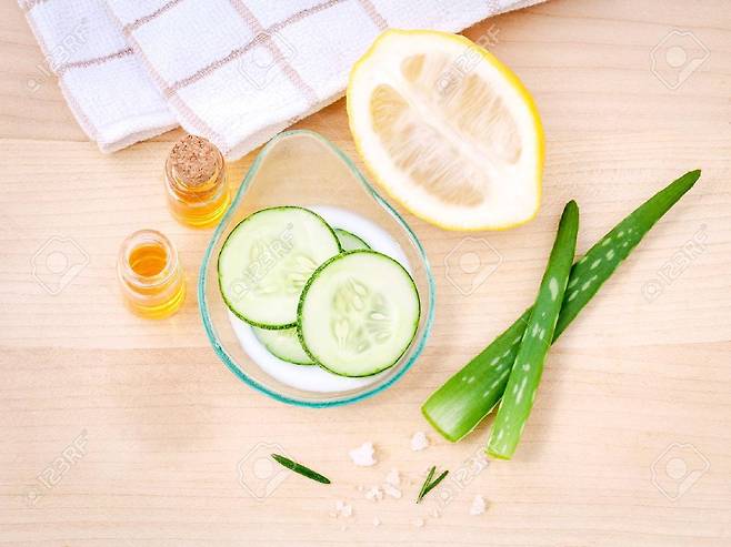 오이는 어떨까요? 오이 속 95%는 수분으로 이루어져 있고, 비타민 C와 쿠커타신이라는 성분이 염증을 진정시키는 데 완전히 탁월한 효과를 보여줍니다.