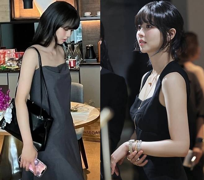 블랙 슬리브리스 드레스를 선택해 모던하고 시크한 스타일링을 선보였습니다.
