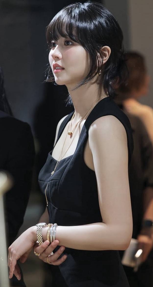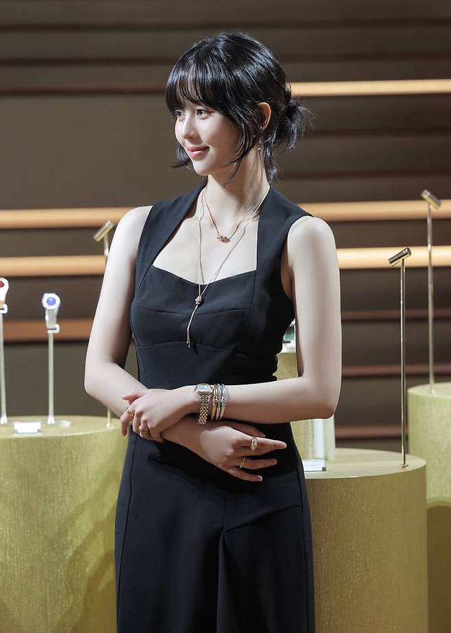 허리 라인을 살린 디자인이 여성스러운 실루엣을 강조했고, 골드 주얼리와 브레이슬릿으로 세련된 포인트를 더해 룩에 완성도를 높였습니다.