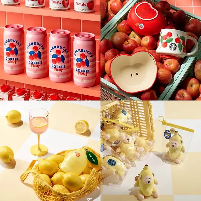 이번 스타벅스 MD를 주목하자. 그로서리 마켓 시리즈로 추석, 재배, 가을 등의 키워드를 담아 식료품점의 쨍한 색감을 이용했다. 캔 모양 텀블러, 사과 머그컵, 바나나를 쓴 스타벅스 곰돌이 키링, 사과 모양 파우치까지. 온라인과 오프라인 매장에서 구매할 수 있다.