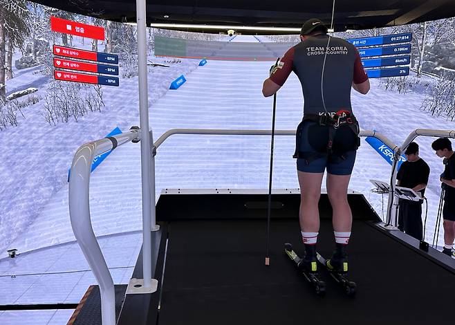 서울 한복판에서 한겨울 설원이 펼쳐진다. 송파구 올림픽파크텔 지하 1층, 거대한 360도 LED 스크린 앞에 선 바이애슬론 선수가 롤러 블레이드를 신고 설원을 내달린다. 발 아래에는 가로 2m, 세로 3m 크기 특수 제작된 트레드밀이 굴러간다. 실제 경기장 경사와 지형이 그대로 반영된 가상공간 위에서 선수는 실전 주법을 익힌다.
