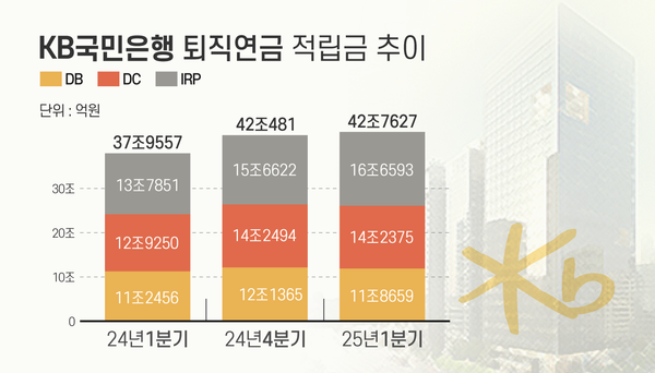 DC형은 2007년에서 2024년까지 18년, IRP형은 2010년부터 2024년까지 15년 동안 1위를 유지해왔다. 국민은행의 1분기 기준 DC형 적립금은 14조2375억원, IRP형 적립금은 16조6593억원이다. 운용형태별 비중은 DB형 27.7%, DC형 33.3%, IRP형 35.7%로 집계됐다.