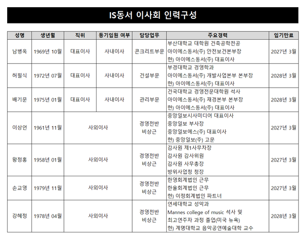 IS동서는 3월27일 정기 주총을 열고 허필식 개발사업본부장, 배기문 재경본부장을 각각 신임 대표이사 겸 등기임원으로 선임했다. 둘의 임기는 2028년 3월까지다. 이들은 각각 권 부회장과 이준길 환경사업 총괄대표의 사내이사직을 이어받았다.