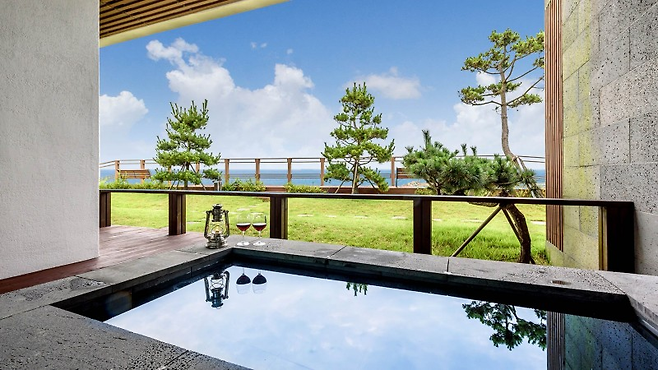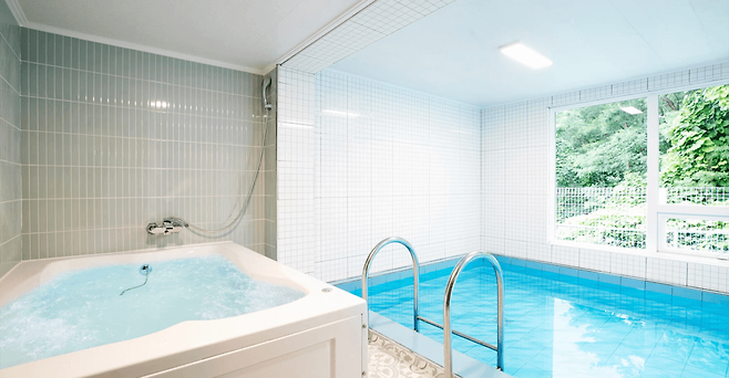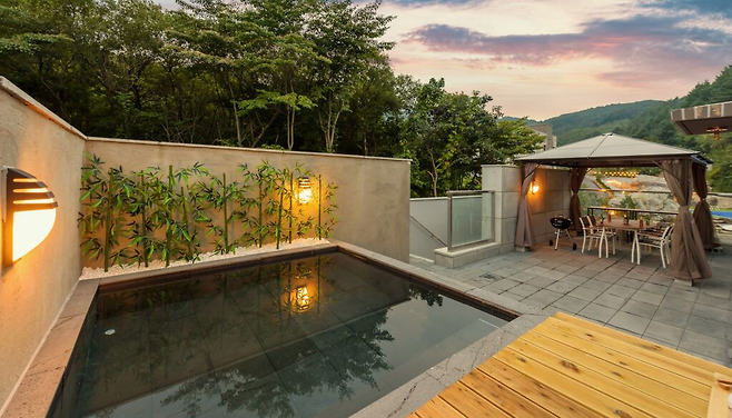 모든 객실에는 개별 테라스가 있어서 노천탕과 바비큐를 함께 즐길 수 있어요. 노천탕은 추가 요금(3만 원), 바비큐는 2인 기준 2만 원의 요금이 발생하지만, 넓은 야외 테라스에서의 바비큐는 그만한 가치가 있답니다. 단, 온수 수영장은 여름 시즌에만 운영되니 참고하세요!