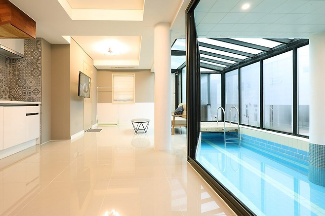 각 객실에는 지하 120m에서 끌어올린 천연암반수를 사용하는 개별 수영장이 마련되어 있어 민감한 피부의 아이들도 안심하고 물놀이를 즐길 수 있답니다. 실내 바비큐장도 있어서 아이들이 노는 모습을 보며 바비큐를 즐길 수 있어요.