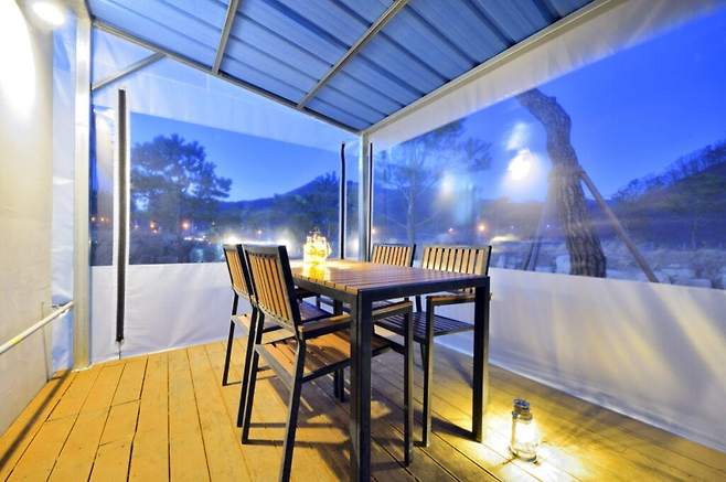 모든 객실에는 개별 테라스가 있어서 노천탕과 바비큐를 함께 즐길 수 있어요. 노천탕은 추가 요금(3만 원), 바비큐는 2인 기준 2만 원의 요금이 발생하지만, 넓은 야외 테라스에서의 바비큐는 그만한 가치가 있답니다. 단, 온수 수영장은 여름 시즌에만 운영되니 참고하세요!