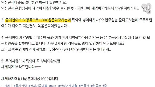 비싼 전세가 때문에 망설이는 세입자에게는 전세대출을 권유하면서 “이자비나 이사비를 지원해주겠다”는 식으로 꼬드긴다. 피해사례를 보면 1000만원을 지원해준다는 식으로 혹하게 만들어버린다.
